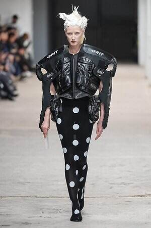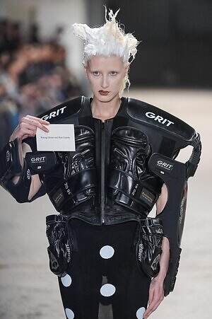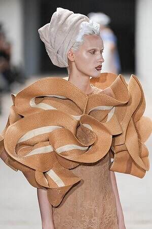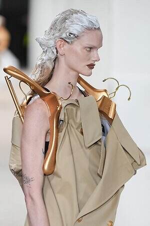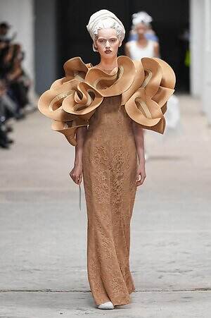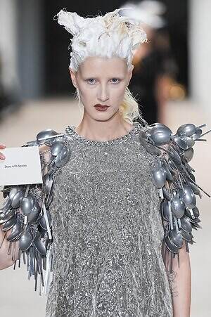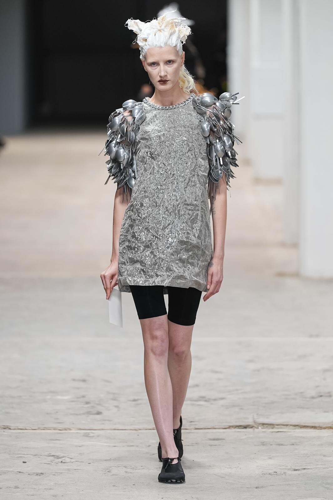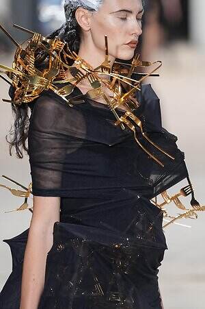 "役割の転換"は、スプーンやフォークといったテーブルウェアにも見ることができた。たとえば、シルバーのトップスのスリーブにあしらわれたスプーンの数々は、メタリックな重厚感を伴って鎧のように堅牢な佇まいを演出。金のフォークは無造作に繋ぎ合わせられ、鋭利な棘を思わせるハードな表情を演出している。