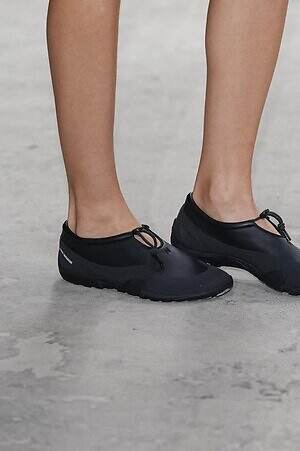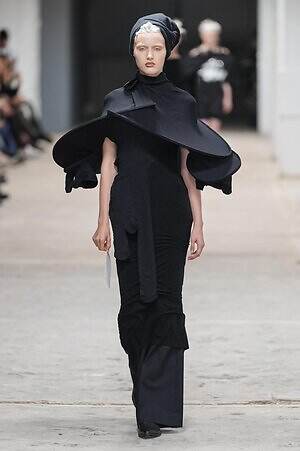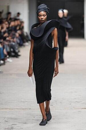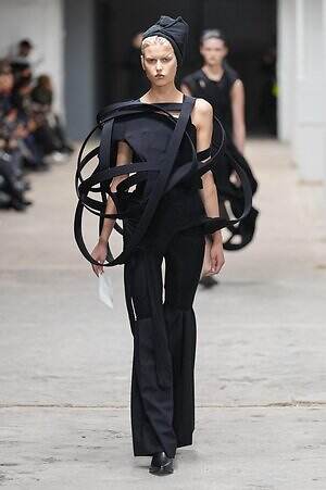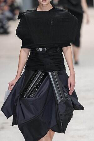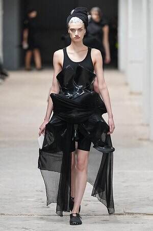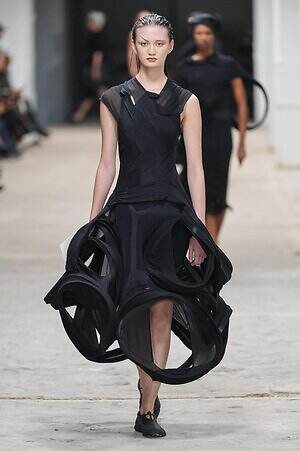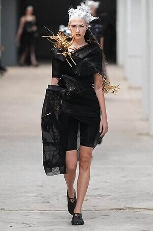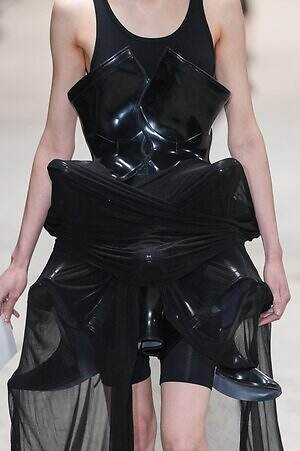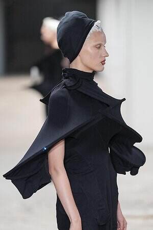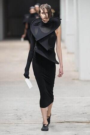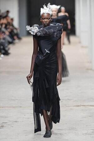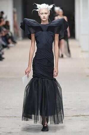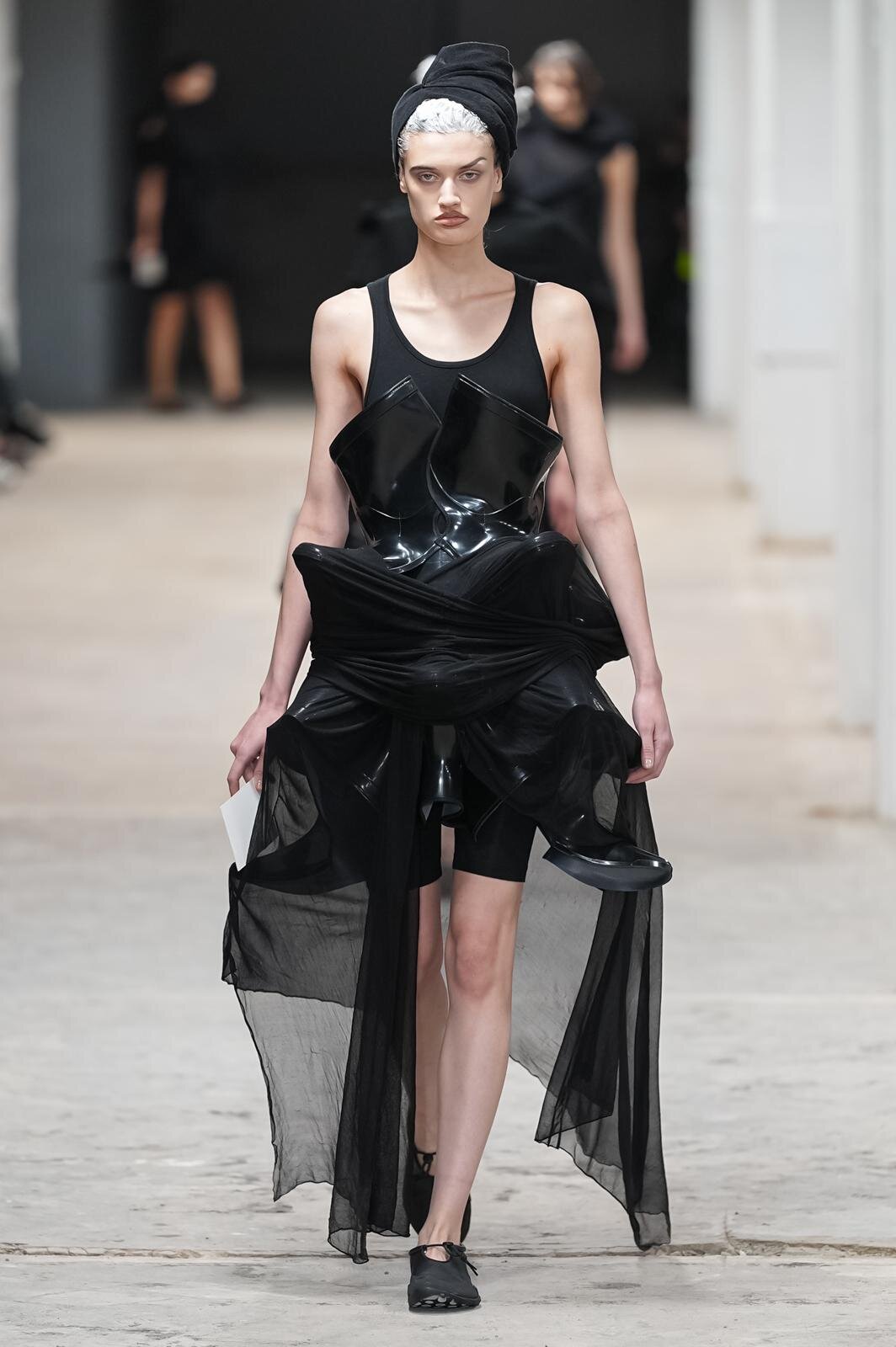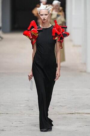 やがてこれらの物体は、衣服を装飾するディテールとしてではなく、シルエットそのものを構築する骨組みへと解釈されてゆく。ツンと上向きに張ったパワーショルダーのブラックドレスは、実は中にシューズを入れてそのダイナミックなフォルムを作り出しているのがユニーク。このほかにも、柔らかくシアーなテキスタイルの中にワイングラスやブーツを忍ばせて、立体的な造形を演出したドレスやスカートが提案された。