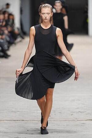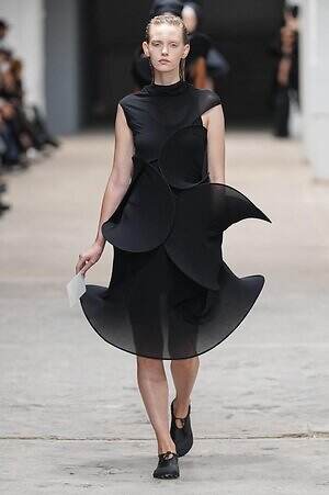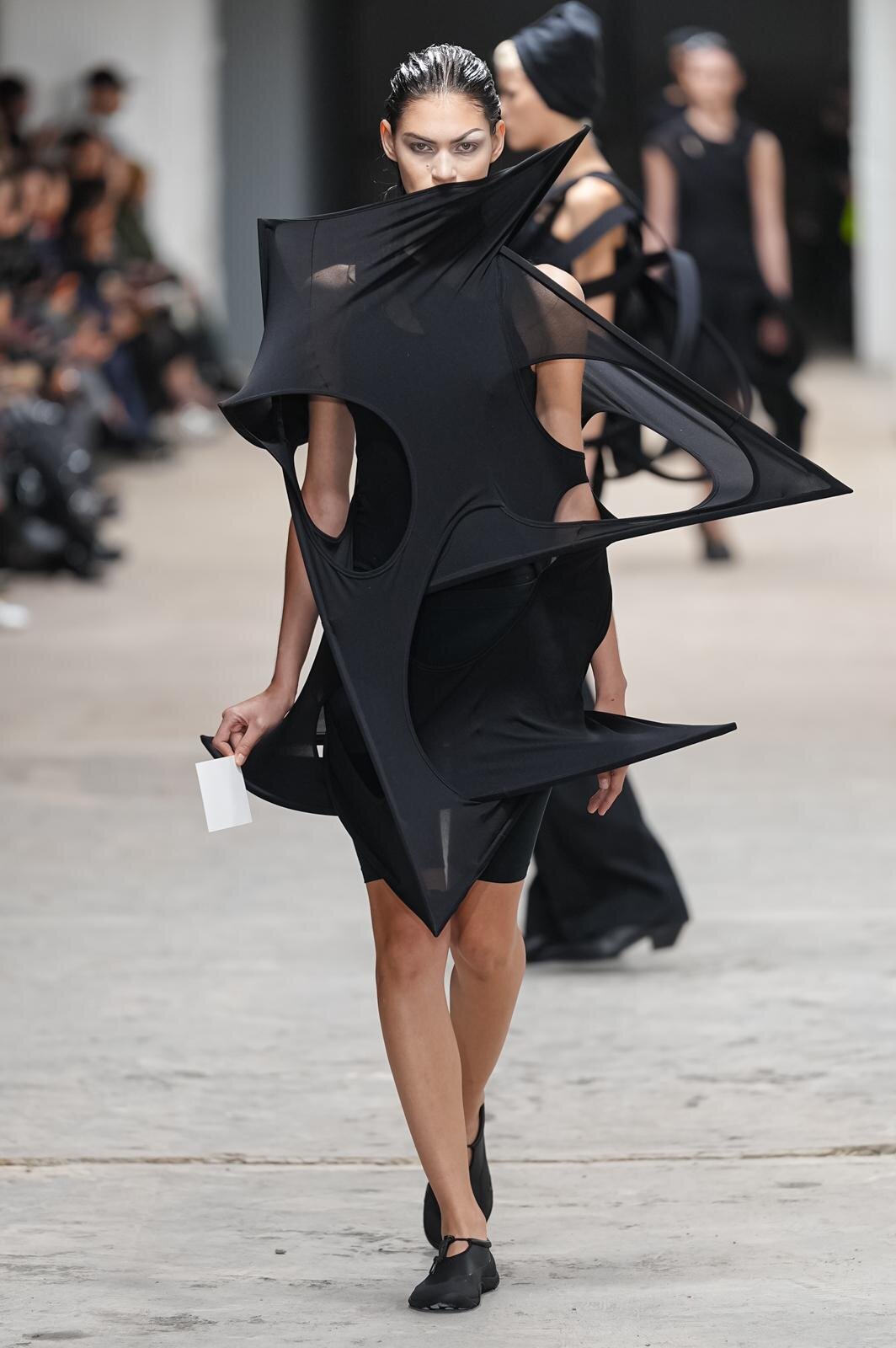 さらにショーが進むと、もはや骨組みこそが主役を張る存在に。自由に組み合わせられた三角形の枠は、伸縮性のあるシアー素材でかろうじて繋がれてはいるものの、今にも生地を突き破りそうな勢いで躍動。花びらのような円形のワイヤーはうねり、波打ちながら、シンプルなミディドレスを大きく変形させている。