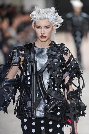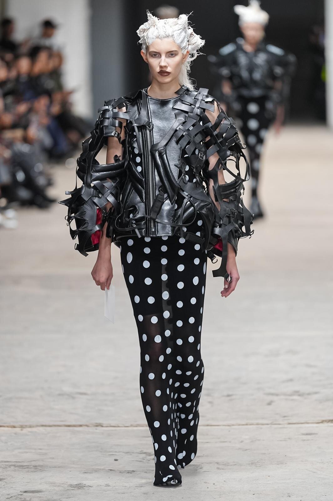 フィナーレを飾るのは、ジュンヤ ワタナベを象徴するレザーピースの数々。パワフルで無骨な印象を持つライダースジャケットだが、今季は一部を解体することで、構築的なフォルムは保ったまま素肌を覗かせる仕様にアレンジした。リボンのディテールや、ドット柄のタイツとのコンビネーションにより、ロマンティックなエッセンスも匂わせている。