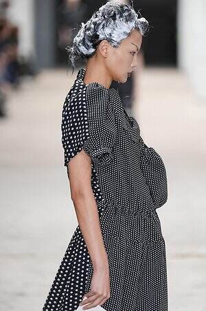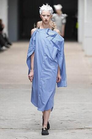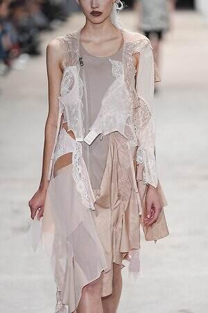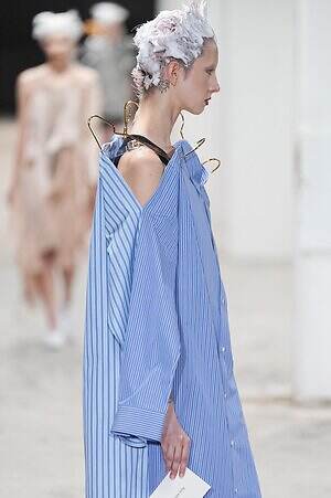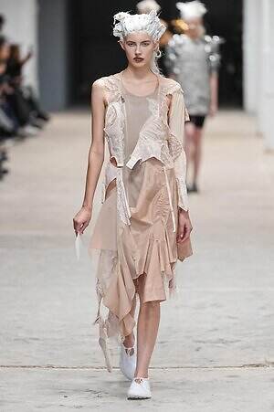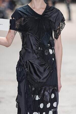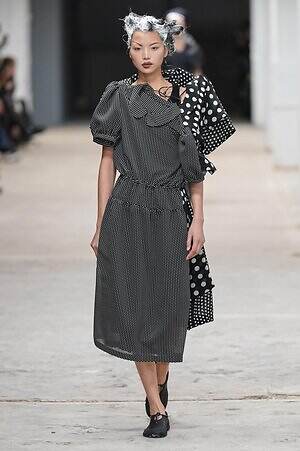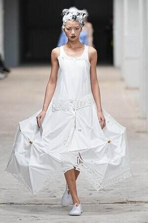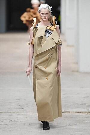 続くルックでは、麦わら帽子をフリル装飾のように見立てたドレスや、純白の日傘をスカート部分に組み込んだワンピース、レースのブラやショーツをパッチワークの如く駆使したヌーディーなシアードレスなどが登場。ハンガーに掛かったままのトレンチコートを2枚繋いで、そのまま衣服として昇華したピースも印象的だ。このように今季は、アイテムが持つ本来の機能を見直し、全く別の役割へと組み替えるアイデアが鍵を握っている。