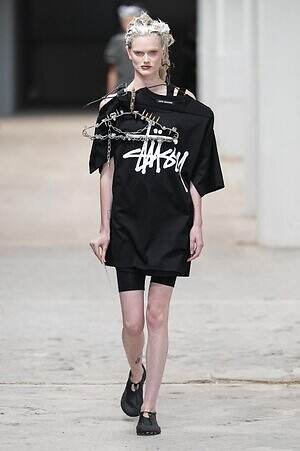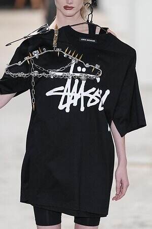 コラボレーションアイテムの注目度も高いジュンヤ ワタナベだが、今季はステューシー(STÜSSY)とタッグを組んだTシャツを展開。フロントにステューシーのロゴを配したアイコニックなTシャツをベースに、ハンガーに掛けた2枚をドッキングするという今季ならではの手法で遊びを加えた。片方のショルダーからは、スタッズやビジューで装飾されたハンガーが垂れ下がっており、ジュエリーのような華やかさとエッジをプラスしている。