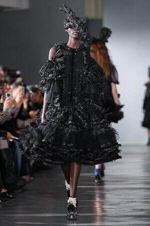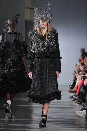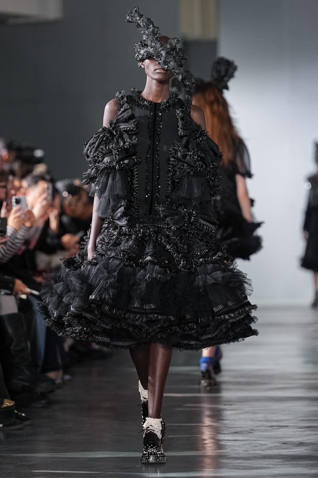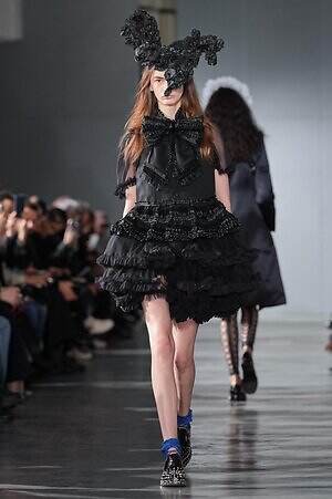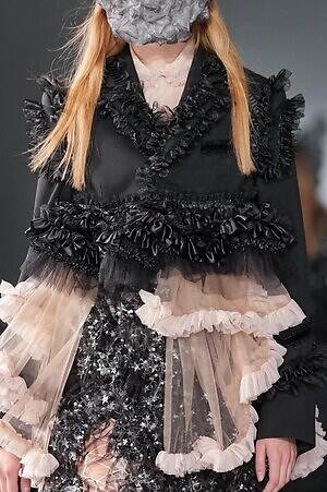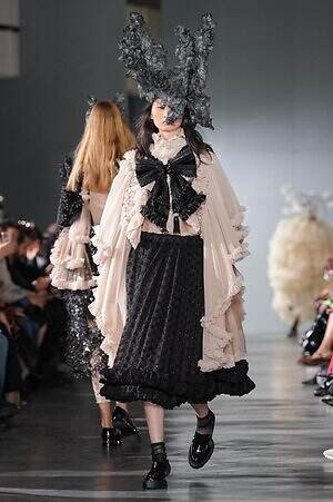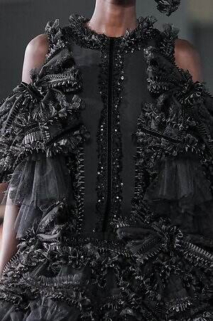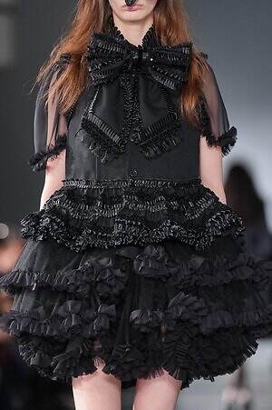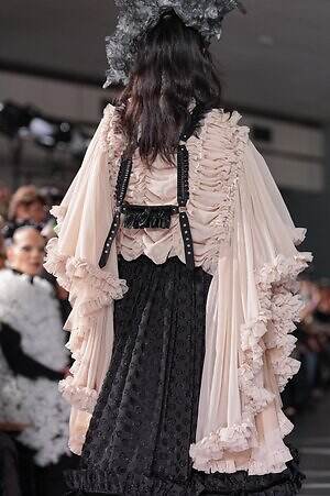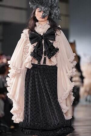 煌めきとは別の角度から、とことんロマンティックに仕立てたピースにも目を向けたい。贅沢に分量を取ったブラックドレスは、溢れんばかりのフリルやチュールを装飾し、抑制された色味の中にポエティックな表情を演出。ゆったりとドレープが流れるケープ状のブラウスは、フロントに配した大ぶりのリボンにより、ゴシック的な甘さを加えている。