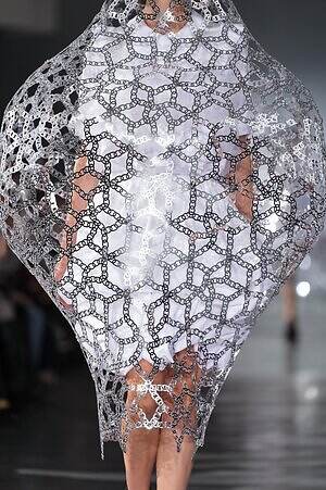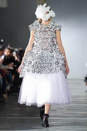 キラキラと煌めくシルバーから始まった今季。星型のパーツを繋ぎ合わせたトップスには、その冷たい質感を引き立てるように、やわらかく揺れるチュールスカートを合わせている。