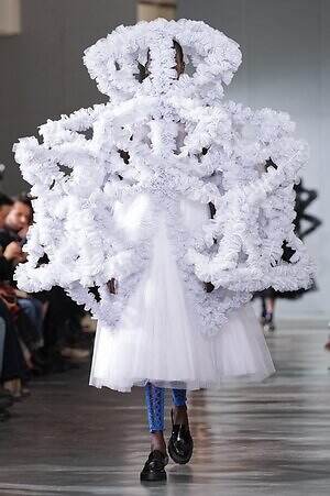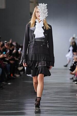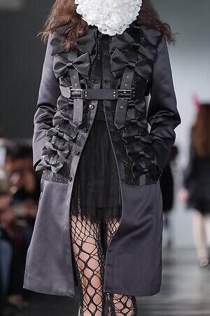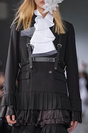 ロマンティックとは無縁に思われるテーラリングも、ウエストから下をシアープリーツで切り替えることでフェミニンに仕上げているのが印象的。ハーネスを取り付けたシャープなジャケットは、背面に白のシフォンドレスが縫い付けられており、前と後ろで受ける印象が全く異なるのが面白い。
