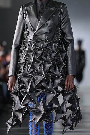 洋服に小宇宙を広げるスターモチーフは、ハードなレザーにおいても用いられている。ブランドを象徴するハーネスは、スタッズを配した星型のレザーピースで遊び心たっぷりに解釈。小さな星から大きな星へと、裾に向かってグラデーションのようにスターパーツを配したレザーコートからは、衣服が夜空に帰していくようなシーンが想起させられた。
