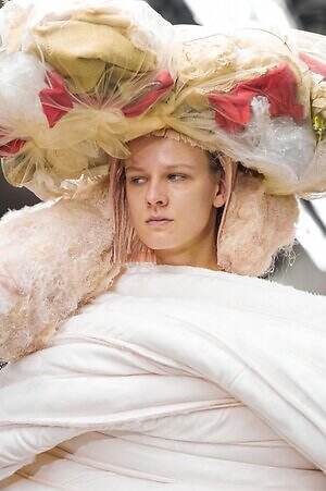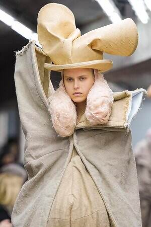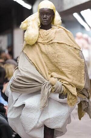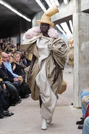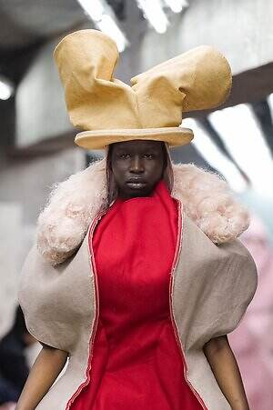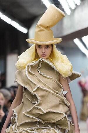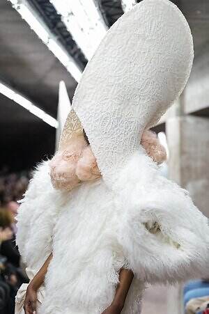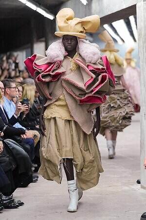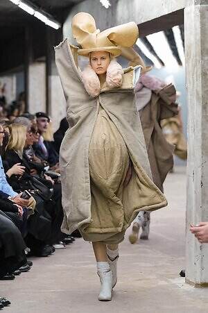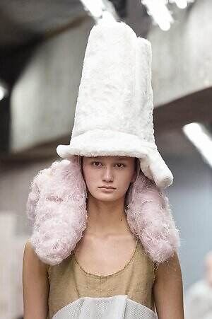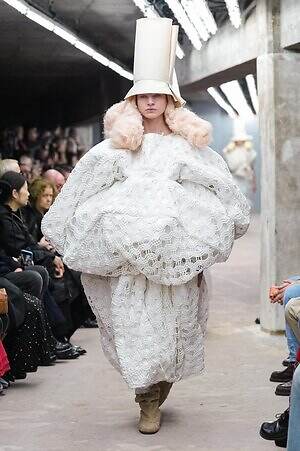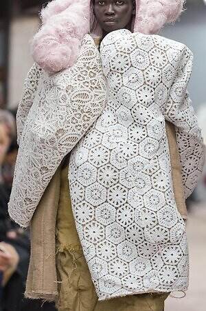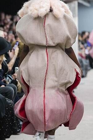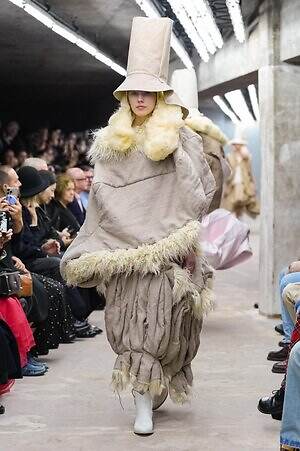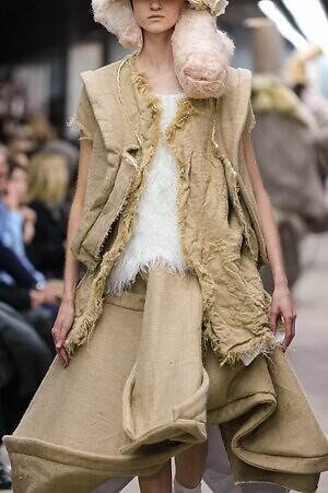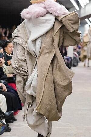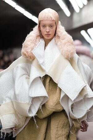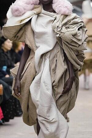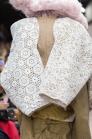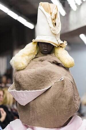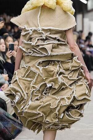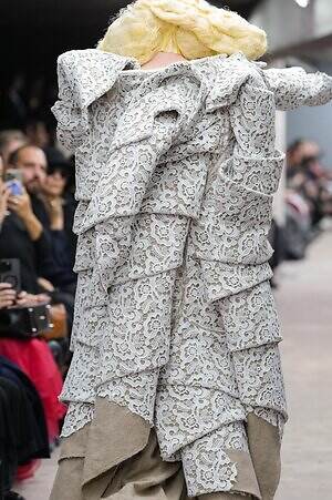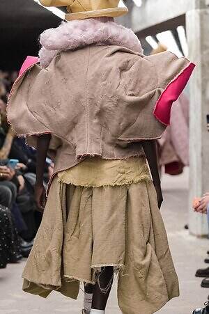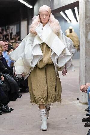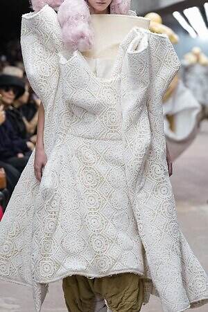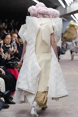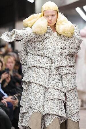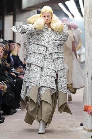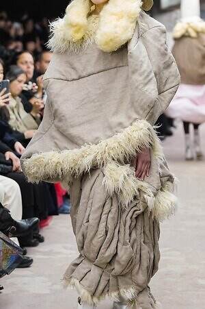 今季のコム デ ギャルソンには、いつになくナチュラルなムードが漂っているように感じられた。麻袋を思わせるベージュのファブリックは粗野に断ち切られ、その素朴な表情を残したまま、唯一無二の形状を持つピースへと昇華されている。このほかにも、クラフト感溢れるレースや刺繍、ファーを思われる毛足の長い素材などが採用され、コレクション全体を温もりある表情で包み込んでいた。