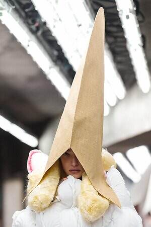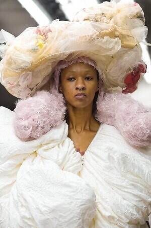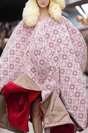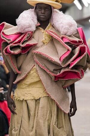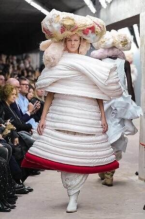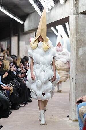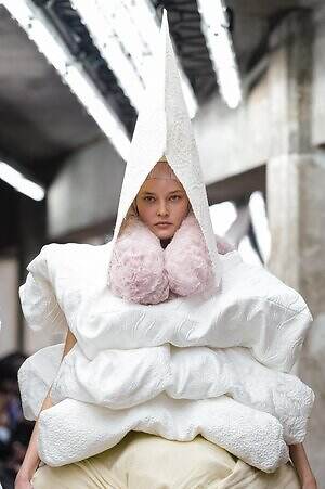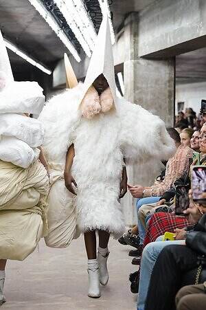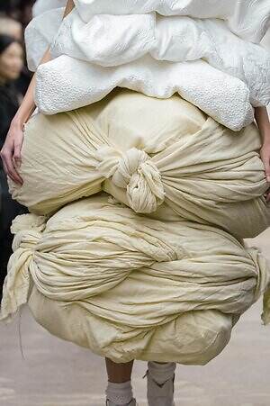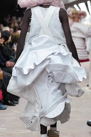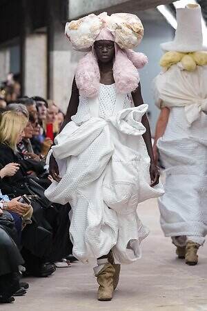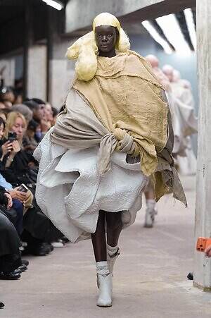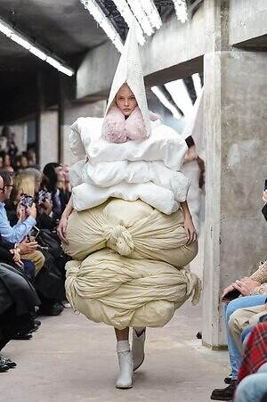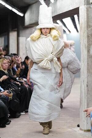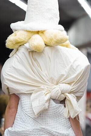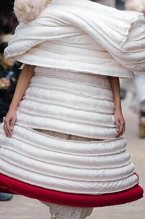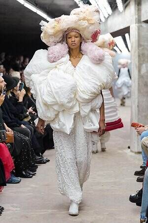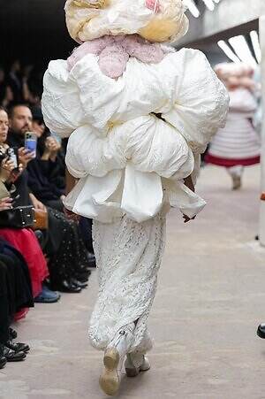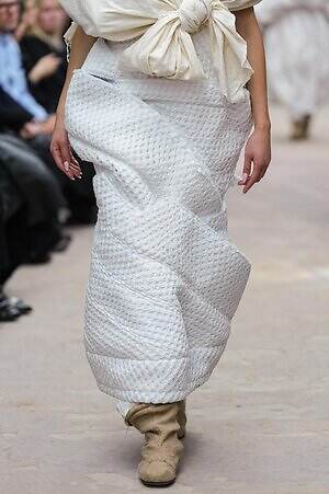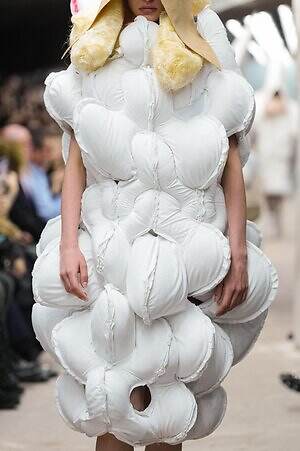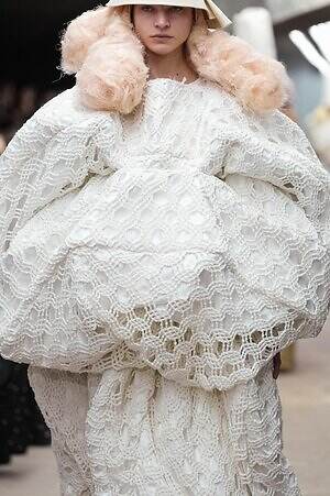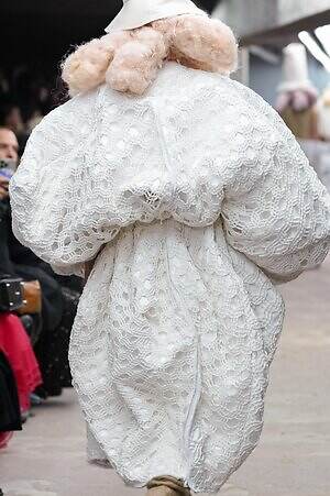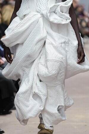 アウター、ドレス、トップス、スカートなどあらゆるコレクションピースが、ランウェイ上でモデルがすれ違うのも難しいほどボリューミーな仕上がりだ。不規則に浮かび上がるひし形のこぶ、風船のようにやわらかな膨らみ、布を幾重にも手繰り寄せてできた豊かなドレープ…気まぐれな造形が次々に立ち現われ、奇跡的なバランスでシルエットの均衡を保っている。
