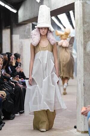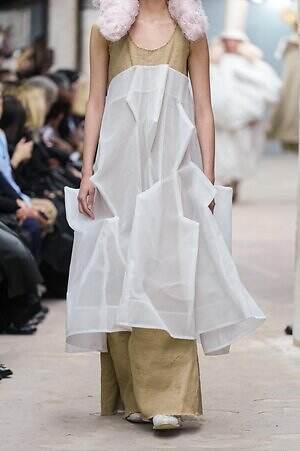 巨大化したドレスの中には、腕がすっぽりと服の中に隠れてしまう、あるいは、そもそもアームホールが設けられていないものも。テキスタイルを折り込んでミルフィーユのような層を描いたピースは、本来アームホールが設定されるであろう場所に短い筒状のパーツがあしらわれており、モデルが歩みを進めるたびにその筒が上下に躍動。中から腕を入れて筒を動かしているのか?腕はいったいどこから出ているのか?予測不可能なフォルムが、観る者の想像力を掻き立てる。