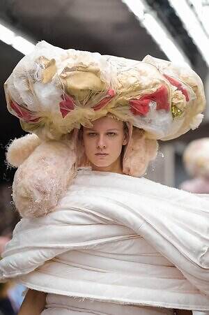 とりわけ目を引いたのが、ふっくらとしたクッション素材を用いたピース。棒状のクッションを何層も重ねたドレスや、大小様々なクッションのこぶをあしらったドレスは、まるでオブジェのような圧倒的な存在感がある。おそらく中綿入りであろう、パフィーな佇まいのパーツを組み合わせたドレスからは、ふかふかの布団にくるまれている時のような安心感が感じられた。