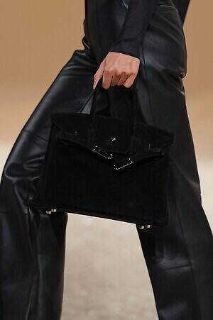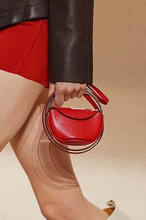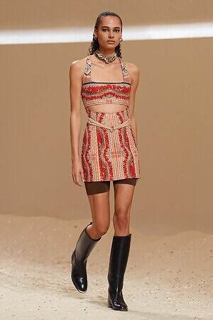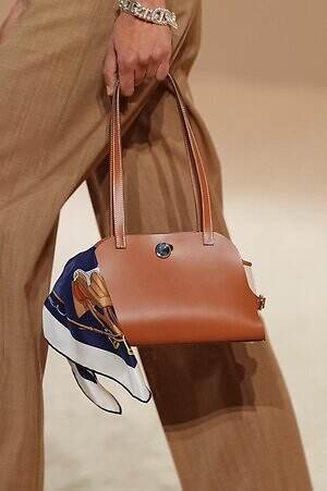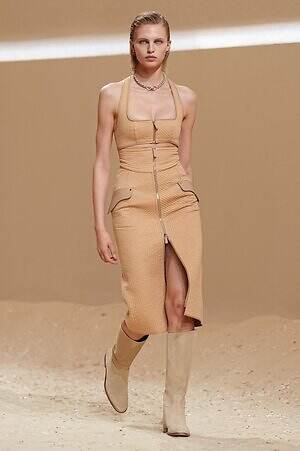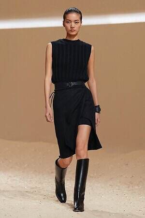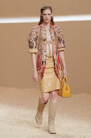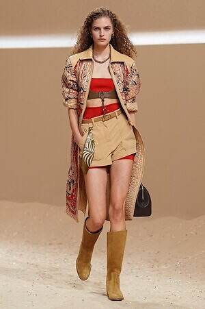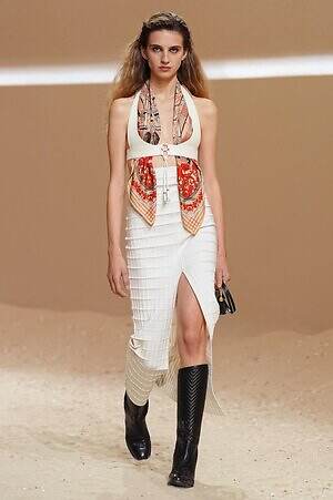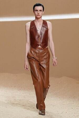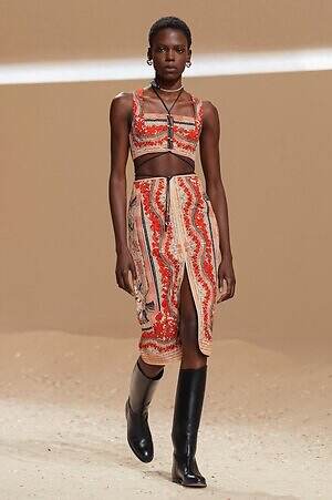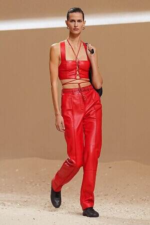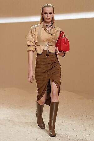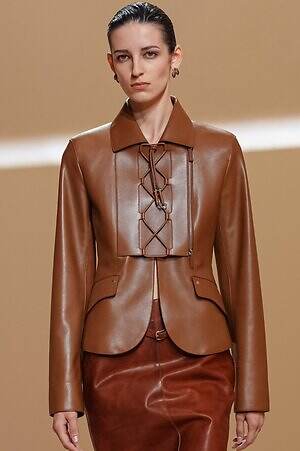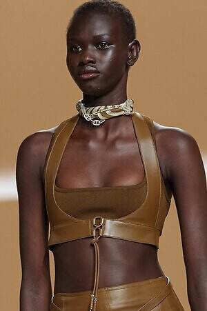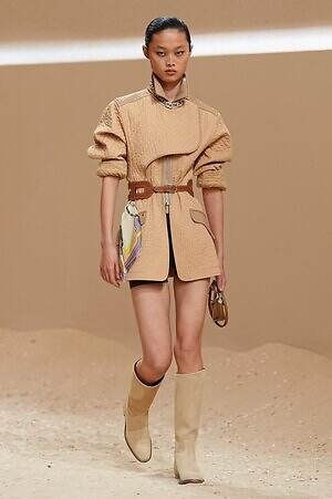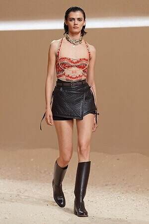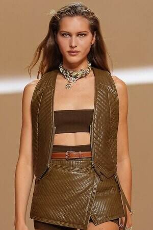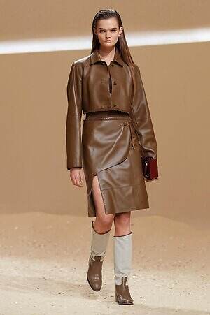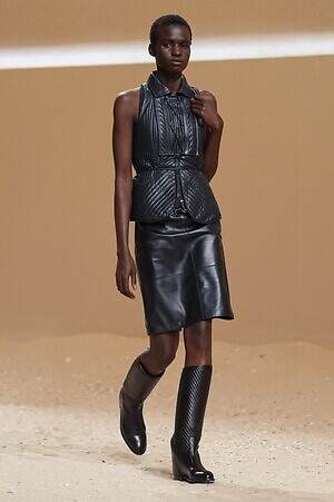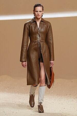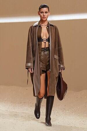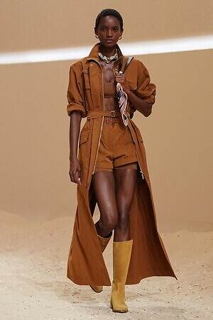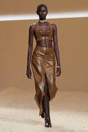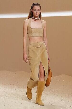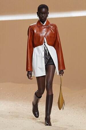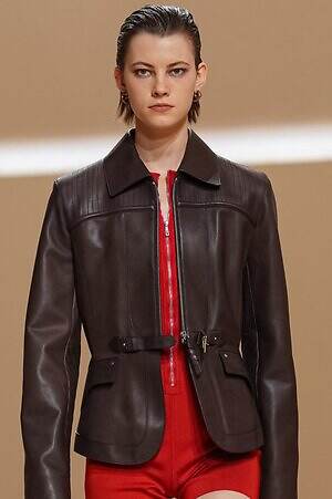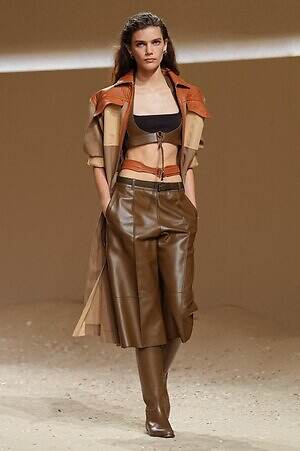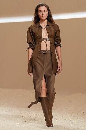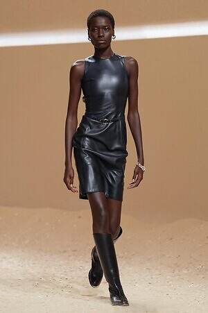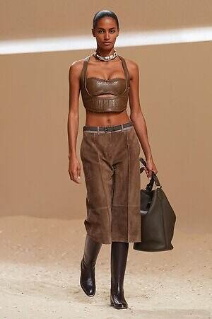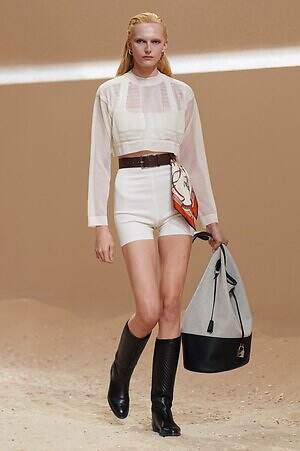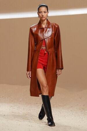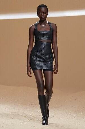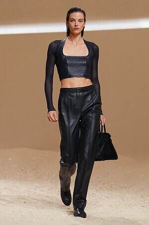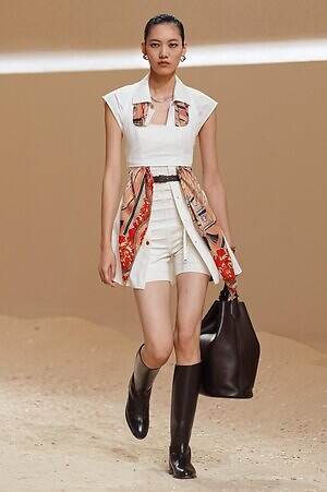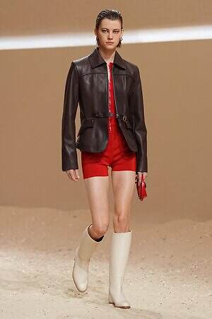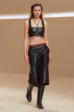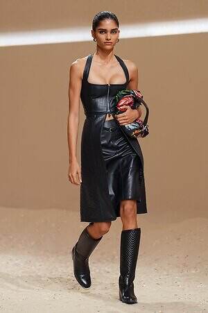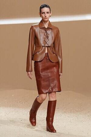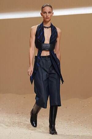 クロップド丈のタンクトップやコルセット風の編み上げディテールを配したビスチェ、大胆にスリットを入れたスカートなど、冒頭から肌を大胆に露出するスタイルが続いた。メゾンの伝統的なシルクのカレは、その流れるようなボリュームをレザーのブラで留めることで、軽やかなトップスへと変身。重厚感のあるレザーコートはサイクリングショーツで引き算し、アクティブなムードへ引き寄せている。