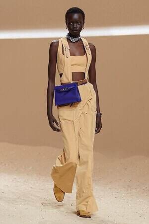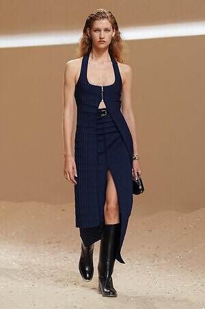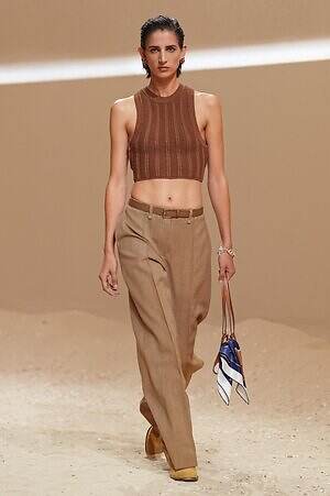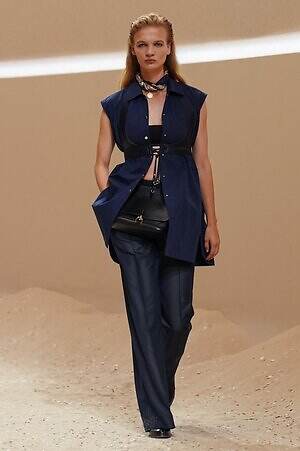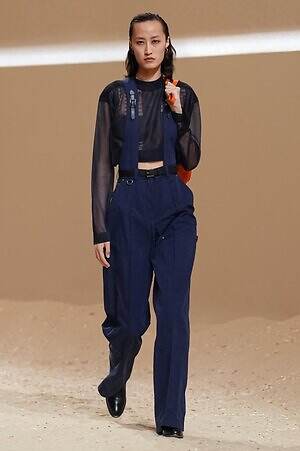 カラーの面では、カーキやブラウン、ベージュといった温もりあふれるアースカラーの中に差し込まれた深いネイビーが印象的だ。涼しくパリッとしたコットンで仕立てられたダンガリー風のハーネスストラップ付きトラウザーや、太陽の光を優しく透かすシアーニットなど、海のエッセンスを漂わせるアイテムに採用され、コレクションに静かなる洗練をもたらした。