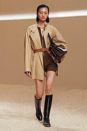今季のテーマをストレートに体現するのが、乗馬のワードローブを女性らしく解釈したスタイルだ。動きやすさを重視したクロップド丈の乗馬ジャケットは、キルティング加工を施したミニ丈のアシンメトリースカートとのコンビネーションでフェミニンな魅力を演出。トレンチコートにインスパイアされたダストコートはハーネスベルトで締め上げ、女性の体躯の美しいラインを引き立てている。