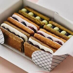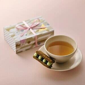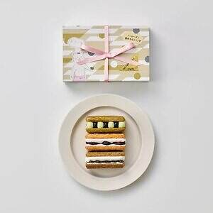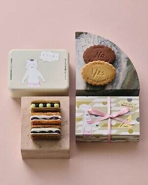 また、ピンクの愛らしいリボンをかけたボックスに、3種のバターサンドを詰め合わせた「ノーレーズン猫村さんドイッチのバターサンド」も。京都・一保堂茶舖の上質な抹茶をふんだんに使用した抹茶バタークリームに、抹茶ミルクジャム、トラヤあんスタンドのあんペースト、もちもちの求肥、レモンコンフィを合わせた「抹茶あんサンド」をはじめ、「ほうじ茶レーズンサンド」、「ベリーベリーチェリーサンド」が揃う。