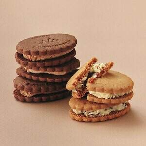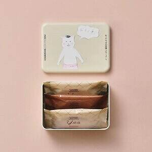 “ドイッチ!”と叫ぶ猫村さんの姿を描いた缶の中には、2種のキャラメルバターサンドをイン。発酵バターのサブレに濃厚バニラキャラメルとレーズンをサンドした「レーズン キャラメルバターサンド」と、クーヴェルチュールチョコレートを使用し、紅茶ミルクキャラメルとアプリコットを合わせた「ショコラアプリコットキャラメルバターサンド」を味わえる。