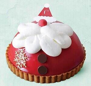 注目は、ケーキ全体でサンタクロースの姿を表現したシーキューブによる「いちごのサンタドーム」。タルト生地に、ベリーシロップを染み込ませたスポンジを重ね、ベリーのジュレやティラミスクリームを合わせている。仕上げにいちご味のグラサージュで覆い、艶やかな見た目に。クリームやチョコレートでサンタクロースのヒゲや真っ赤な鼻などを表した、遊び心溢れるビジュアルを楽しめる。