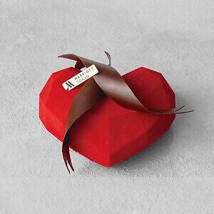 東京マリオットホテルが贈る「ノエル クール」は、幾何学的なハート型ケーキ。食感のアクセントとなるビスキュイジョコンドをベースに、オレンジアメールジュレやピスタチオのクレーム、あまおうとホワイトチョコのムースなどを重ね、多層的な味わいを楽しめる1品に仕上げた。