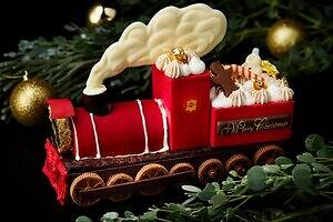 クリスマスに夢や希望を乗せて走る列車をイメージした「クリスマストレインケーキ」。鮮やかないちごムースでできた車体には、ティラミスの荷台やガトーショコラの土台を合わせている。