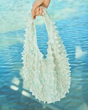 サテン生地を円形に縫製して仕立てたこのバッグは、高い伸縮性が魅力。A4サイズまで収納できる容量を備えながら、物を入れていないときはコンパクトに持ち運ぶことができる。手洗いが可能なイージーケア仕様なのもうれしいポイントだ。