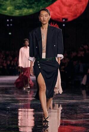 シャネルを象徴するツイードは、軽やかに進化。アイコニックなシャネルジャケットをシャツに変化させたり、丸みを帯びたコクーンシルエットにアレンジしたりして、実用性と魅力的な要素を融合させた。ツイードのペンシルスカートは、片側に大きくスリットを入れて開放的なムードに。ウエストをゆったりとドロップさせる着こなしも見られた。