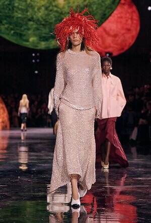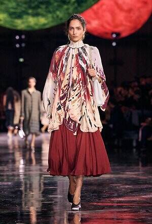 マチューは、シャネルのデイウェアを時間を超越した存在として再解釈。クラシックなアイテムを、まるで代々受け継がれてきたかのような親しみのある風合いに仕上げた。シルクニットのスーツにはシワ加工が施されたカメリアの花が溶け込み、ほつれたツイードは縁取りや刺繍によって再構築。ハンドバッグ「2.55」は長年大切に使い込まれてペタンコになったようなデザインで、伝統的なバーガンディのレザーライニングが露わになっている。