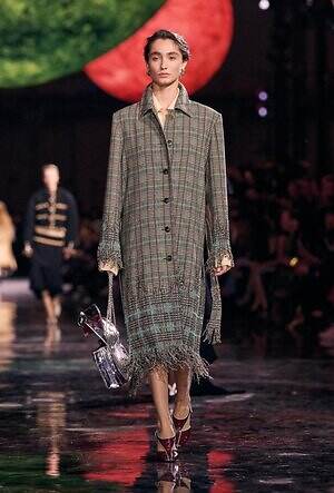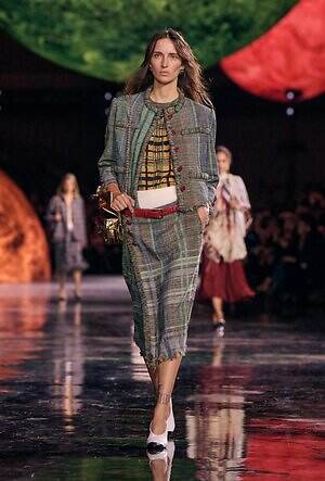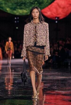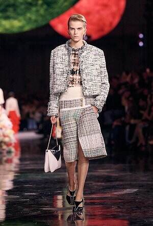 シャネルの普遍的なベーシックアイテムには、過去から未来へのアイデアを宿して。ツイードの格子柄は手編みのニットやシースルー素材へと姿を変え、涼やかなトップスやスカートへと進化。ローライズのスカートとパンツは、ウエストからアンダーウェア的なディテールを覗かせ、現代的なアクセントをプラスしている。