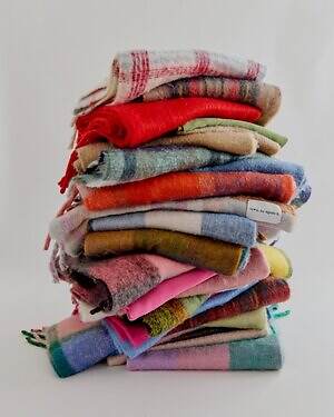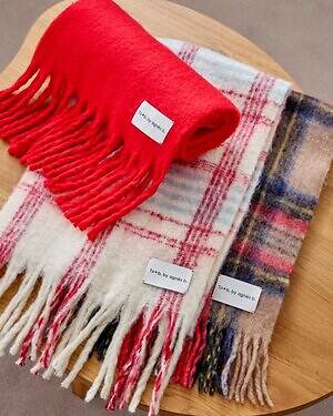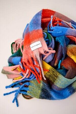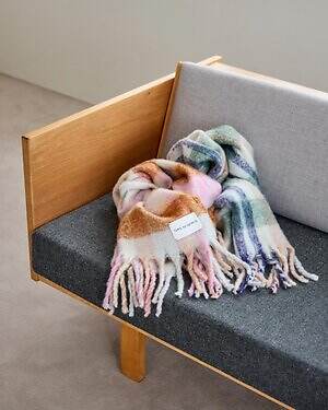チェック柄マフラーは、配色やパターンの異なる3種類を展開。なかでも目を引く「ブロックチェックストール」は、鮮やかな色を大胆に組み合わせた。ピンクやブルー、イエローなどのトーンが重なり合い、巻き方によって見え方が変化する。