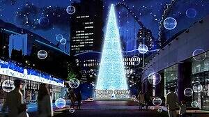 目玉となるのは、青と白に輝く高さ約15mのツリー。15分に1度行われる光とシャボン玉の特別演出では、周囲のビジョン映像とも連動し、鑑賞者を没入感溢れる体験へと誘う。ライトアップされたアトラクションや都会の街並みを背景にした幻想的な空間を堪能することができる。