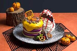 「ハロウィンナイトパンケーキ」は、ハロウィンカラーに彩られた‟秋の味覚”を使用した限定パンケーキだ。濃厚なパンプキンクリームに、笑みを浮かべるジャック・オ・ランタンと‟RIP”の墓石を模したクッキーをトッピングしているのが特徴だ。