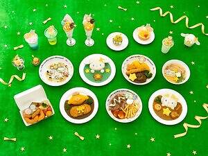 クリスマス限定のフード&ドリンクは、全17種類を用意。リボンや星をまとったハローキティがモチーフのオムレツカレーをはじめ、ポムポムプリンのマシュマロと輝く星をトッピングしたアイス、緑と黄色のグラデーションカラーが美しいマイメロディのメロンソーダなど、見た目も味も楽しめるメニューが盛りだくさんだ。