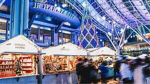 たくさんの人々でにぎわうクリスマスマーケットは、JR博多駅前広場をはじめ、福岡大丸エルガーラ・パサージュ広場、福岡市役所西側ふれあい広場、福岡タワー前 緑実広場、そして小倉の紫川親水広場・船場広場といった各スポットにて開催。煌めくツリーや幻想的なイルミネーションの中で、ホットワインなどのグルメやクリスマス雑貨のショッピングを楽しめる。