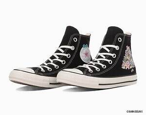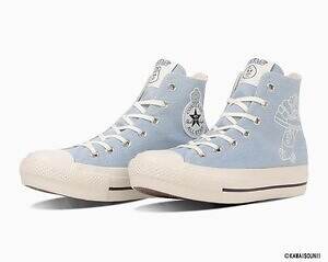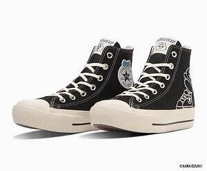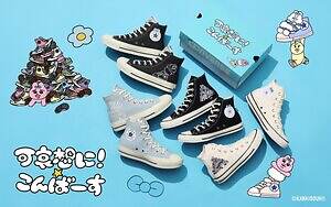 注目は、デニム素材のアッパーに「おぱんちゅうさぎ」と「んぽちゃむ」のイラストをそれぞれ刺繍したモデル。アンクルパッチの星マークやシュータンにもキャラクターの顔を配し、遊び心溢れるデザインに仕上げている。人気スニーカー「オールスター PLTS」をベースにした厚底ソールも魅力だ。