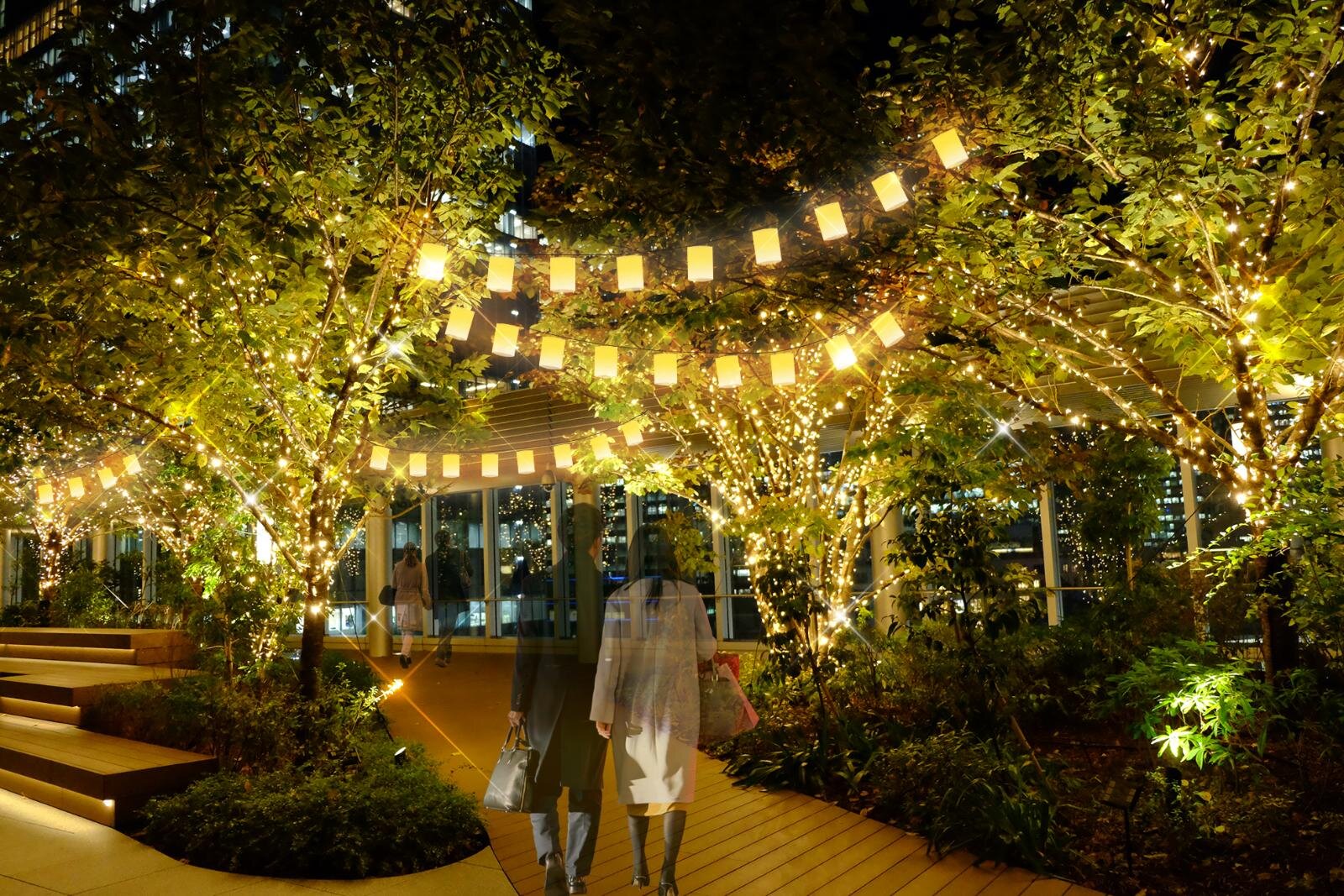 5階の屋外テラスには、東京駅の夜景とともに楽しめるシャンパンゴールドのイルミネーションが登場。テラスを歩くたびに光の輝きや表情が変化し、光のグラデーションが感じられる。今回はツリーイルミネーションの間にランタンも加わり、より一層クリスマスのムードを演出する。