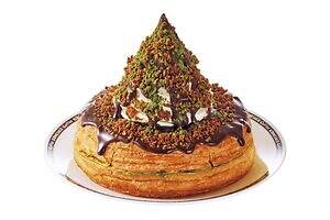 あたたかいデニッシュで、祇園辻利の宇治抹茶を使用した宇治抹茶クリームをサンド。ソフトクリームにかけて固まったチョコソースのパリッと感と、トッピングのクランチのザックザク感は、まさに「ブラックモンブラン」そのもの。宇治抹茶の風味も相まって、味わいに奥行きが生まれている。