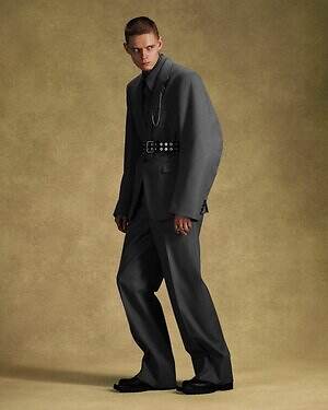 注目は、迫力のある前振りのオーバーサイズスリーブが目を惹くシングルジャケット。戦時中の軍服に着想を得た、極端にカーブを描く袖のシルエットが特徴だ。ワイドストレートのトラウザーズとセットアップで着用できる。素材はいずれも、ほどよい粗さと上品な柔らかさが特徴のバラシャ織りのウール生地を使用している。