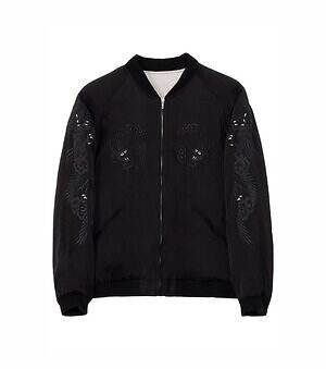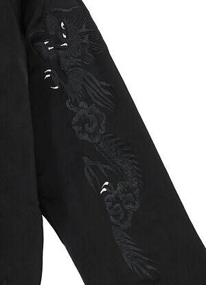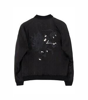 新作スカジャンは、あえて袖に刺繍を施したデザインが特徴。ブラックの面には、躍動感あふれる龍の刺繍が見て取れる。従来しなやかなサテン地への刺繍には高い技術が求められるが、独自の技術と手法を駆使することで、サテン独自の軽やかさを損なうことなく刺繍を施しているのがポイントだ。
