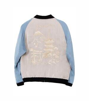 また、柔和なオフホワイトのボディにブルーの袖を合わせた面には、背中に刺繍をプラス。五重塔や富士山、鳥居を生地と同じオフホワイトの糸で刺繍することで、どこか幻想的な表情に仕上げている。