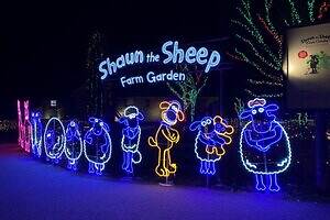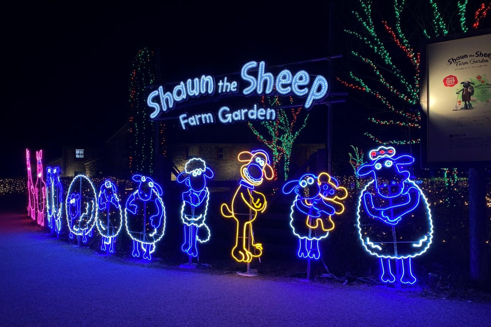 英国アードマンアニメーションズ完全監修の世界初エリアとしてオープンした「ひつじのショーンファームガーデン」も、昼とは異なる雰囲気に。イルミネーションで飾られた「ひつじのショーン」の世界を楽しめるほか、キャラクターたちのネオンイルミネーションに出会える。