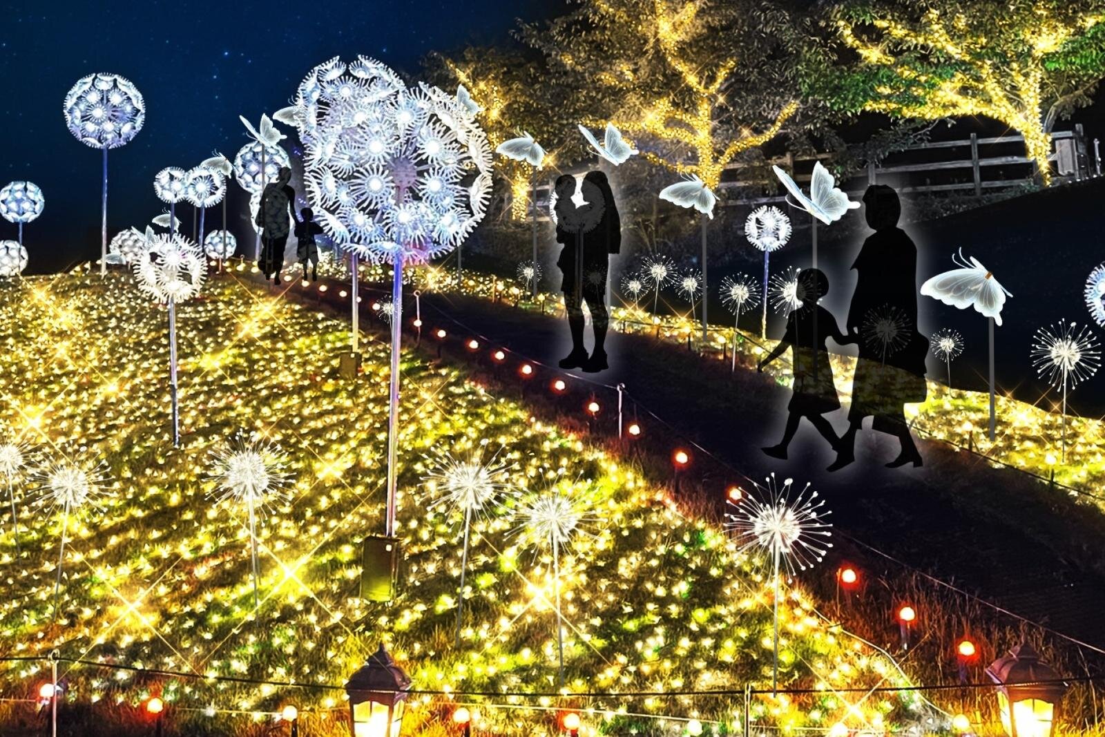 そこを抜ければ、満開に咲くタンポポを彷彿とさせるゴールドのイルミネーションに彩られた丘が広がる。中には白い綿毛がやさしく輝き、煌めく蝶がひらひらと楽しそうに舞う。