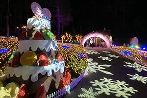 「光るブドウハウス」の先にある丘の上の「フェアリーガーデン」は、可愛い小どうぶつや大きなキノコが光るエリア。一方、となりあう「キャンディガーデン」は、カラフルでポップなお菓子の世界だ。ここには、大きなドーナツのアーチやバウムクーヘンのベンチ、デコレーションケーキなどがあり、大人も子供も楽しい気分になれそう。