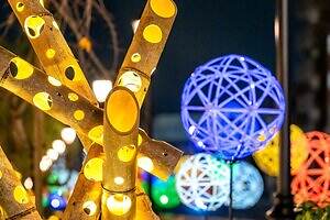 「東京下町回遊 竹あかり」は、2022年のスタート以来4年目を迎える冬イベントだ。2025年は、北十間川河川テラスのライトアップエリアを拡大し、源森橋~小梅橋間も新たに光の装飾を点灯。合計約400メートルにわたって、竹のオブジェと竹毬(たけまり)を装飾し、幻想的な“光の道”を演出する。