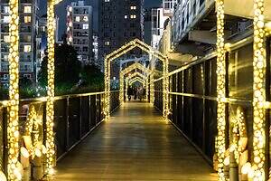 北十間川河川テラスから浅草駅方面に続く歩道橋「すみだリバーウォーク」も「竹あかり」の温かな光で包まれる。オブジェやアーチの織りなす、冬ならではの華やかな光景に注目だ。この他、牛嶋神社にはカラフルな竹毬の装飾を施し、タリーズコーヒー花川戸隅田公園店、 東京スカイツリー5階出口フロアには光のオブジェが設置される。