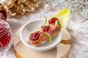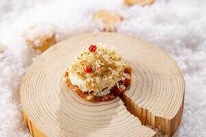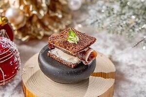 肉料理と併せて味わうサイドメニューは、クリスマスカラーのドールハウス型スタンドで用意。ホームパーティーの食卓を囲むように、生ハムやスモークダック、ブリーチーズなどを使った4種の前菜が並ぶ。焦がしバターをきかせた黒パン「パンパーニッケル」で、スパイス香るりんごのチャツネを生ハムと挟んだ一品や、クランベリーソースを添えた「スモークダックブレスト」、いちじくジャムを合わせた「ブリーチーズタルトレット」など、多彩な味わいを少しずつ楽しめる。