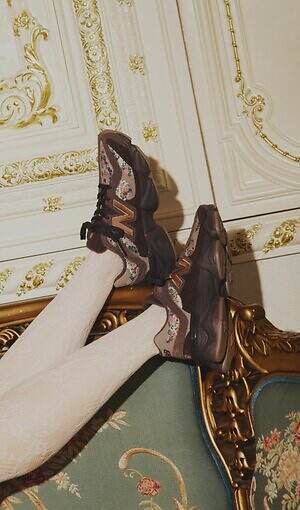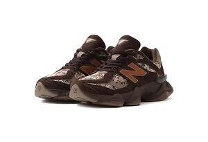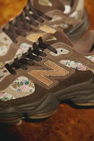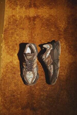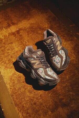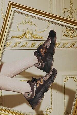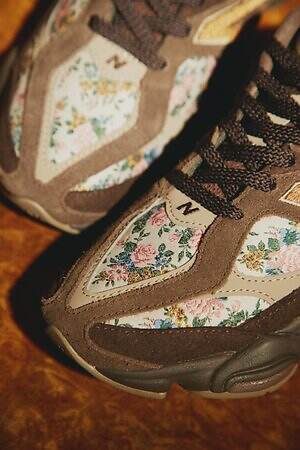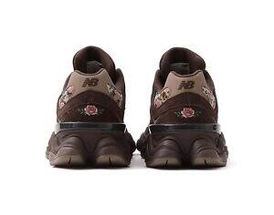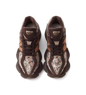 アトモス ピンクのコラボレーションスニーカーには、マリー・アントワネットが生きた18世紀を背景に、ヴェルサイユ宮殿の優雅なゴブラン織をイメージした花柄をオン。深みのあるブラウンのパーツと、繊細に織り込まれた花柄を調和させつつ、「9060」の個性的なフォルムと組み合わせることで、アトモス ピンクらしいストリートテイストに表現している。