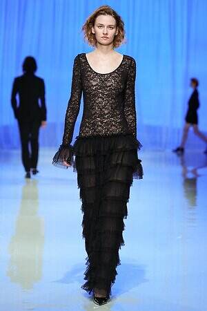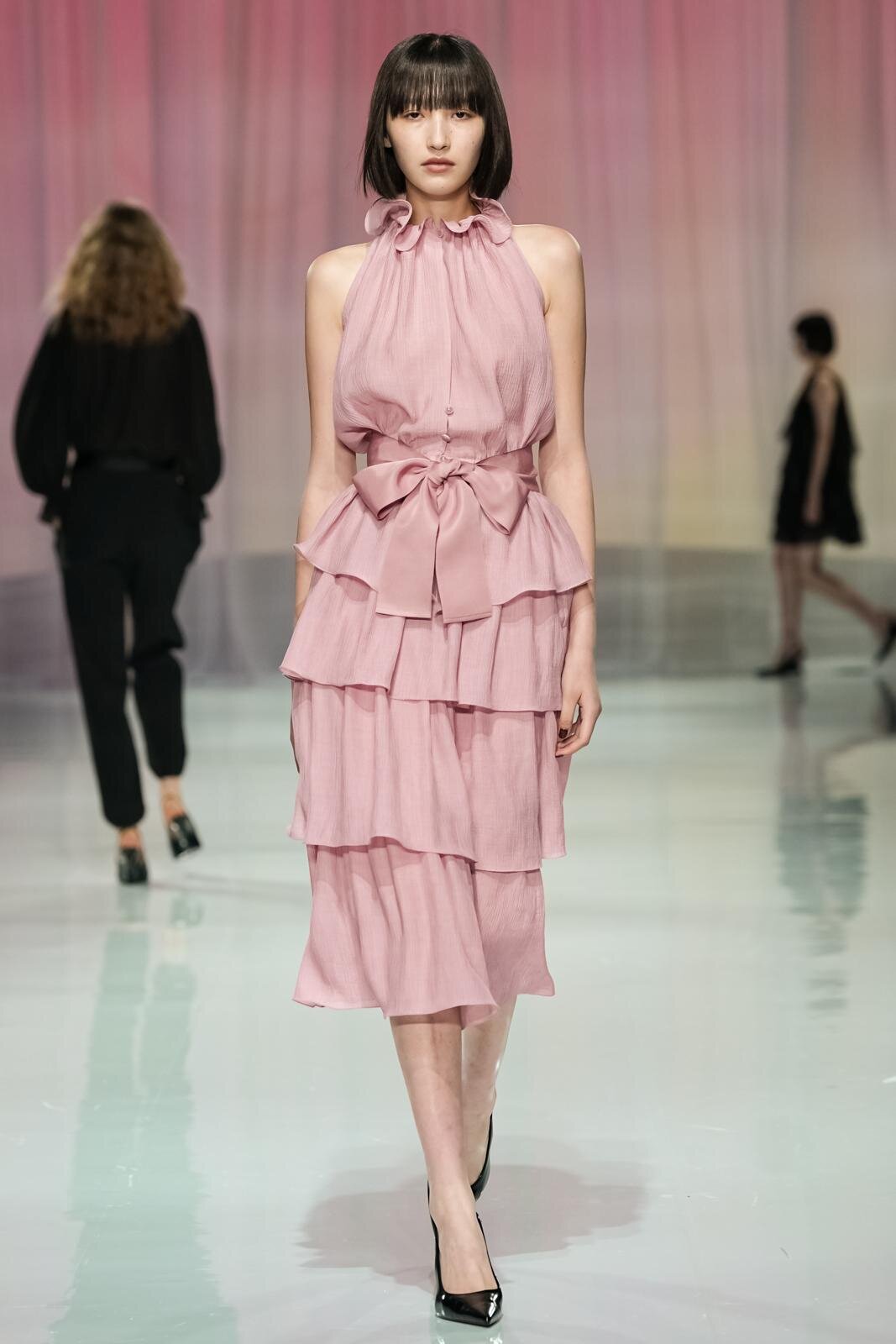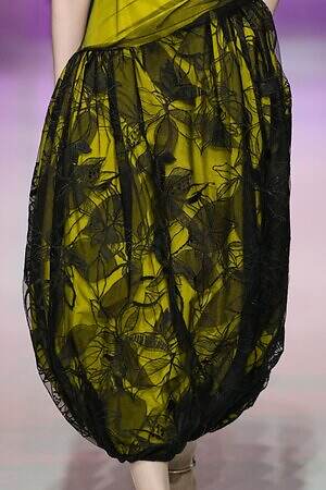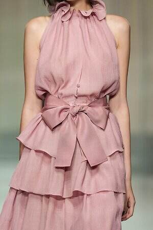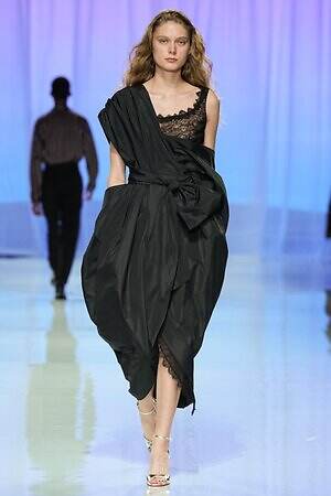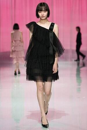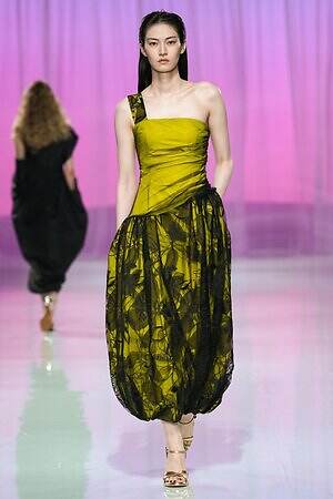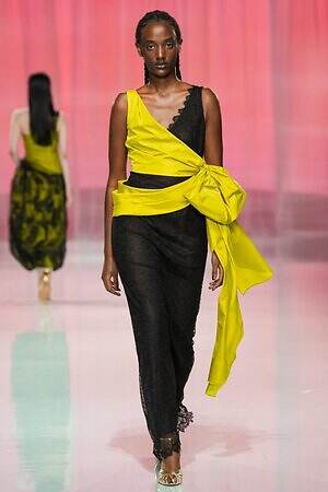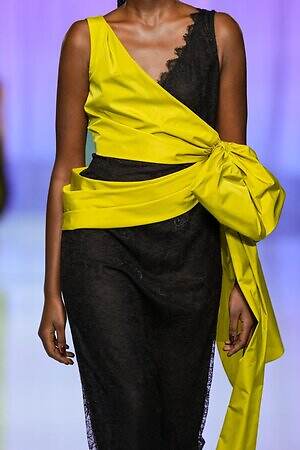 ウエストにリボンをあしらったティアードドレスから、イエローの布をリボンのように結んだ黒いレースドレス、左肩のみ落としたカシュクールドレスまで、ルックを華やかにドレスアップするディテールが散見された。