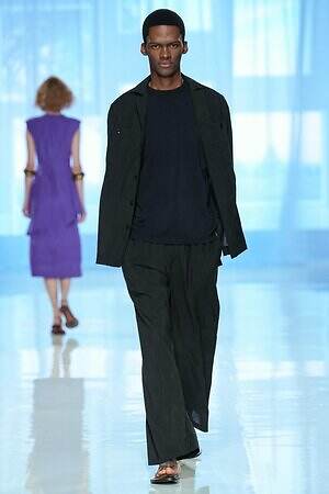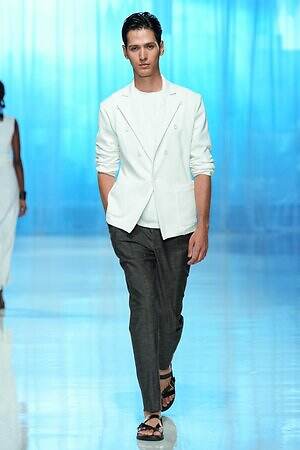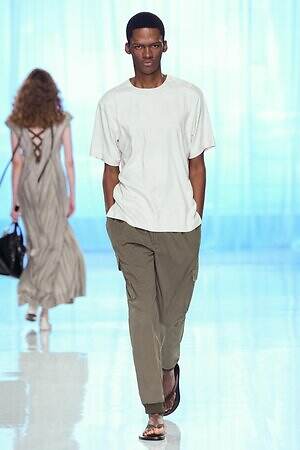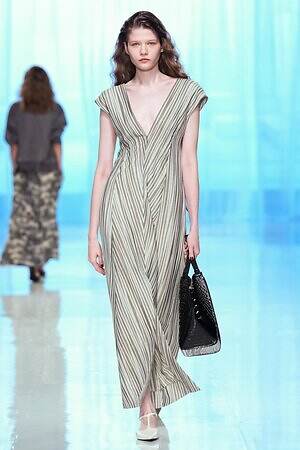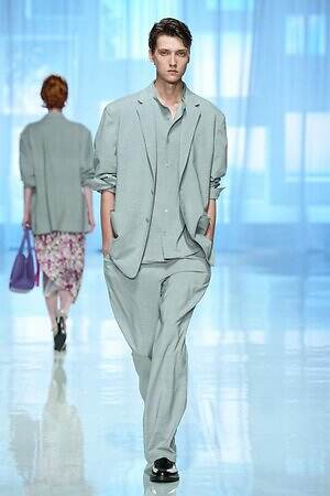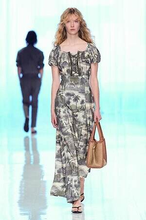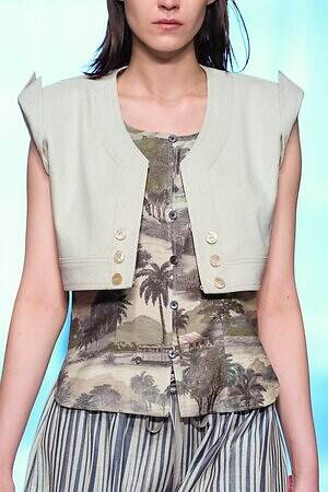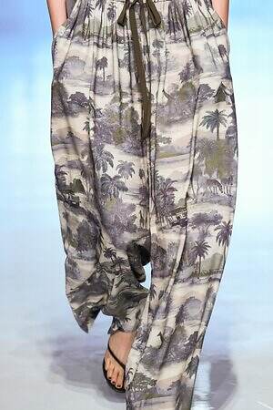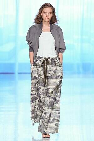南国らしいヤシの木と山々が描かれたリラックスパンツを皮切りに、ストライプ柄のVネックワンピース、空気をはらんだリネンのジャケットやハーフパンツ、ボタニカル柄の巻きスカートなどが続き、その予感は現実のものとなった。
