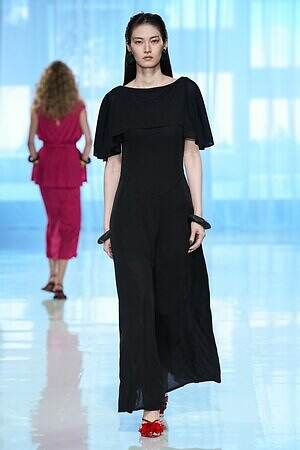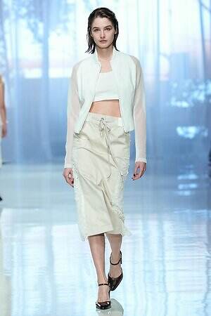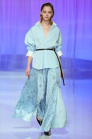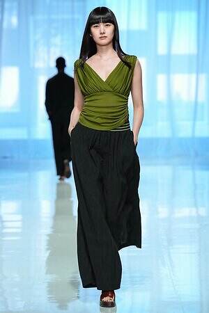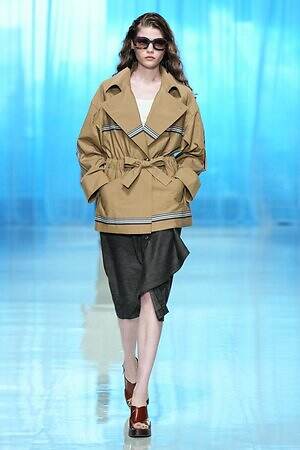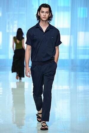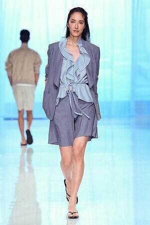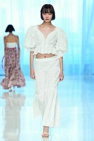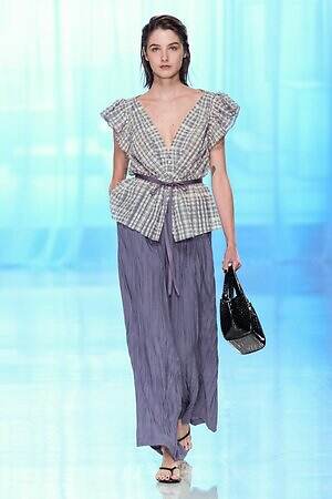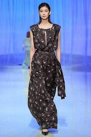 モニターに上空からの景色が映し出され、旅に出る予感とともに幕を開けた今季のタエ アシダ。ブランドが持つ軽やかさを最大限に活かした素材やシルエット、パターン、ディテールからなる‟現代のエレガンス”を体現するコレクションを展開する。