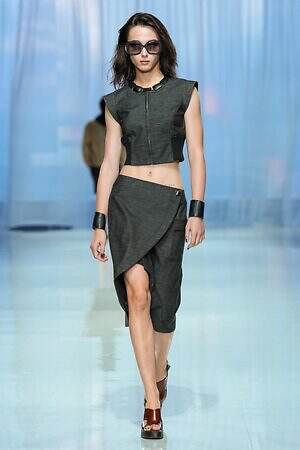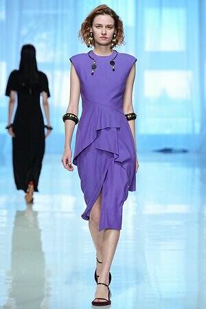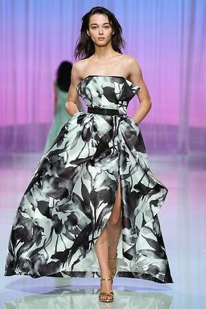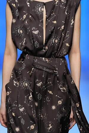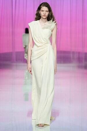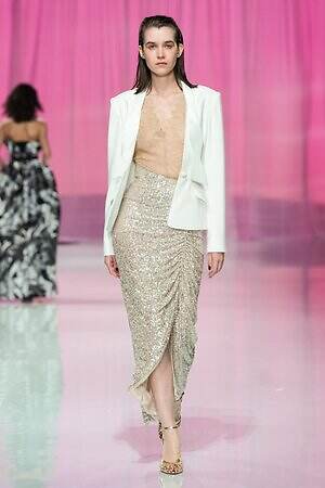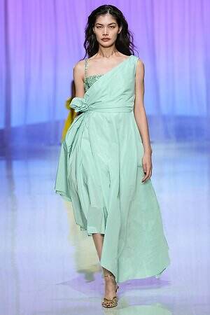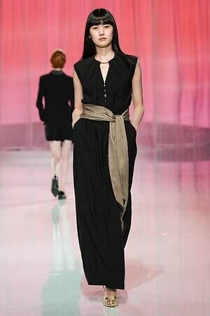 プレゼントのように‟全身をラッピング”したルックも今季ならでは。たとえば、スパンコール煌めくキャミソールドレスの上から、サテン生地で全身を包み込んだルックは、左肩のワンショルダーでほどよくセンシュアルな雰囲気を演出している。