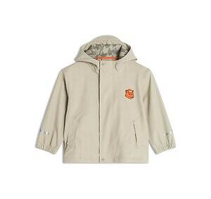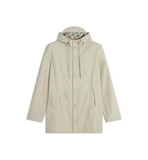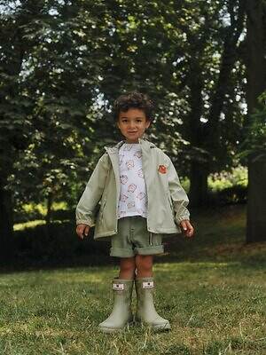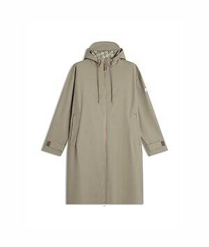ウェアには、ベージュのレインコートやセージグリーンのレインジャケットがラインナップ。袖にはコラボレーションロゴが配されているほか、ライニングにシェブロンモチーフの総柄プリントが施されている。