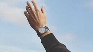 チャコールグレー、もしくはブルーのラバーストラップを配したリミテッド・エディションの腕時計は、インデックスや針をブルーのスーパールミノバでコーティング。明るいブルーの差し色が目を引く。